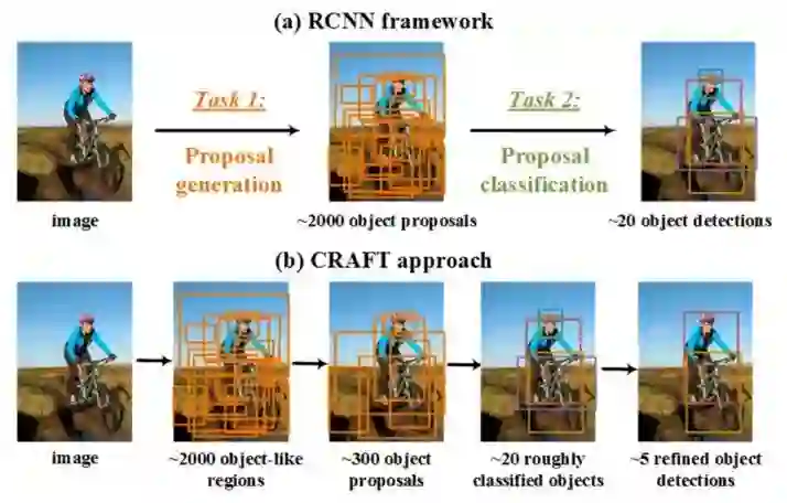 R-CNN 系列算法的第一阶段是生成目标 proposals,第二阶段是对目标 proposals 进行分类,2016 年中科院自动化所提出的 CRAFT 算法分别对 Faster R-CNN 中的这两个阶段进行了一定的改进。对于生成目标 proposals 阶段,在 RPN 的后面加了一个二值的 Fast R-CNN 分类器来对 RPN 生成的 proposals 进行进一步的筛选,留下一些高质量的 proposals;对于第二阶段的目标 proposals 分类,在原来的分类器后又级联了 N 个类别(不包含背景类)的二值分类器以进行更精细的目标检测。