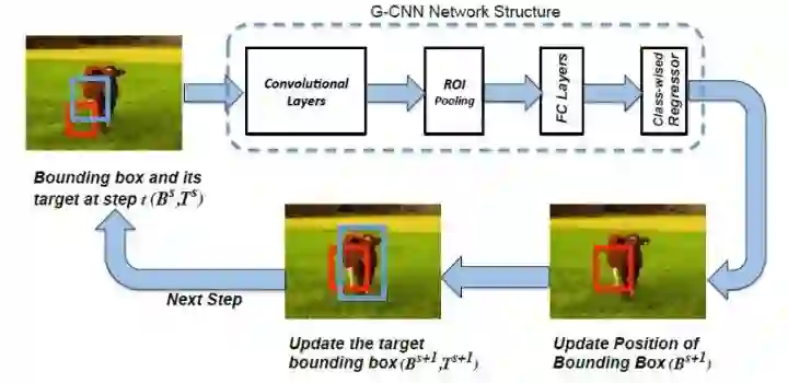 由于巨大的 proposal 数量使得后续检测效率降低,2016 年马里兰大学的 M Najibi 等提出一种起始于网格迭代的 G-CNN 算法。通过初始化对图像划分回归后得到更加接近物体的候选框,再利用回归框作为原始窗口进行回归调整,解决了以往的基于区域提名方法通过海量潜在候选框直接进行目标搜索,抑制负样本的缺陷。