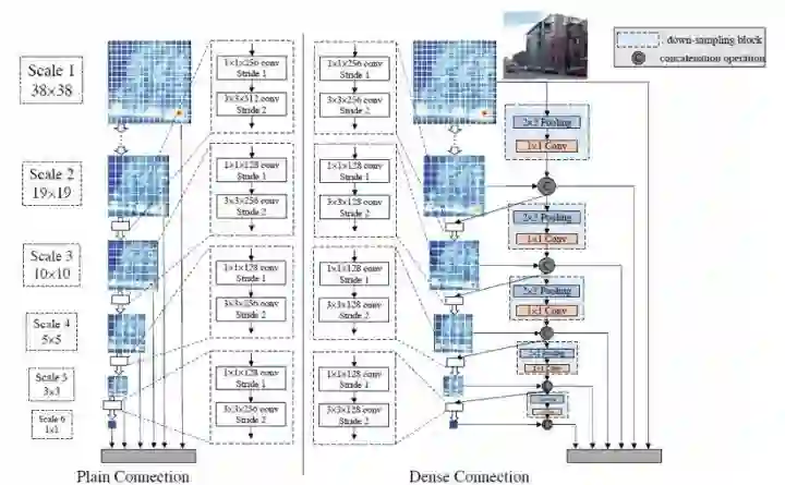SSD 算法是在六个尺度的特征图上进行检测,将这六个检测结果综合起来,DSOD 算法则则根据 DenseNet 的设计原理,将相邻的检测结果一半一半的结合起来。DSOD 算法是基于 SSD 算法基础上做的修改,采用的特征提取网络是 DenseNet。采用 Dense Block 结构,能避免梯度消失的情况。同时利用 Dense Prediction 结构,也能大大减少模型的参数量,特征包含更多信息。设计 stem 结构能减少输入图片信息的丢失,stem 结构由 3×3 卷积和 2×2 的 max pool 层组成,其还可以提高算法检测的 mAP。