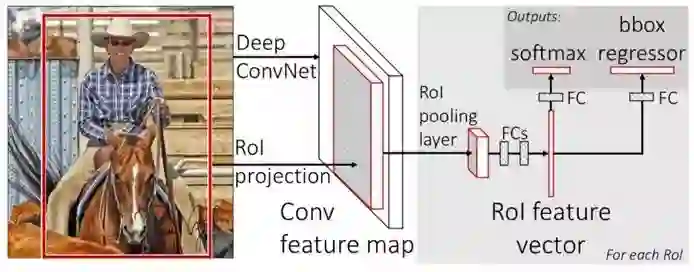 针对 SPP-Net 算法的问题,2015 年微软研究院的 Ross B. Girshick 又提出一种改进的 Fast R-CNN 算法,借鉴 SPP-Net 算法结构,设计一种 ROI pooling 的池化层结构,有效解决 R-CNN 算法必须将图像区域剪裁、缩放到相同尺寸大小的操作。提出多任务损失函数思想,将分类损失和边框回归损失结合统一训练学习,并输出对应分类和边框坐标,不再需要额外的硬盘空间来存储中间层的特征,梯度能够通过 RoI Pooling 层直接传播。但是其仍然没有摆脱选择性搜索算法生成正负样本候选框的问题。