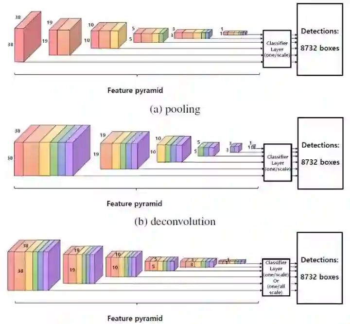 2017 年首尔大学提出了 R-SSD 算法,解决了 SSD 算法中不同层 feature map 都是独立作为分类网络的输入,容易出现相同物体被不同大小的框同时检测出来的情况,还有对小尺寸物体的检测效果比较差的情况。R-SSD 算法一方面利用分类网络增加不同层之间的 feature map 联系,减少重复框的出现;另一方面增加 feature pyramid 中 feature map 的个数,使其可以检测更多的小尺寸物体。特征融合方式采用同时利用 pooling 和 deconvolution 进行特征融合,这种特征融合方式使得融合后每一层的 feature map 个数都相同,因此可以共用部分参数,具体来讲就是 default boxes 的参数共享。