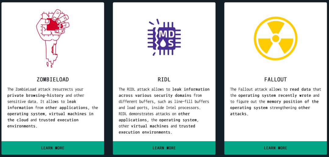 还有RIDL和Fallout(CVE-2018-12126、CVE-2018-12127和CVE-2019-11091),可以被用来从内存中窃取机密信息。