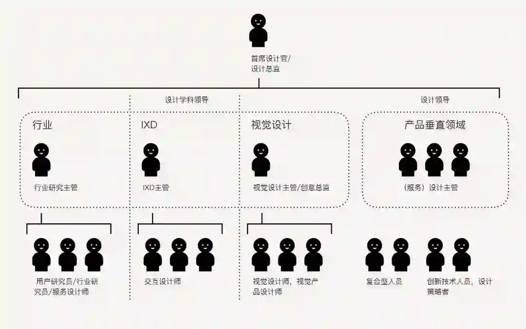一个强大的跨学科、跨领域设计准则可以增强产品垂直领域的设计能力。跨学科设计准则通常具有矩阵结构。水平层次代表不同的设计学科子领域,由各设计学科负责人领导,在不同的产品垂直领域充当设计顾问。设计学科负责人负责提高整个设计学科团队的设计竞争力。产品垂直领域的设计团队是由服务设计领导者(SDL)领导的。SDL的重点主要放在产品上,并与产品经理携手进行紧密的合作。
