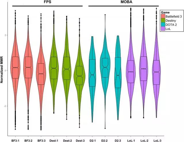 第二项研究则分析了来自四款游戏的大量数据,包括两款 MOBA 游戏《英雄联盟》、《DOTA 2》,以及两款FPS游戏《命运》和《战地风云3》。研究人员分析了包含数千玩家的数据集,发现在MOBA 游戏的玩家中,随着年龄的增长,他们的游戏表现和 IQ 的变化趋势是类似的。在 FPS 类游戏中,则不存在类似的情况,FPS 游戏中玩家的游戏水平在青少年时期后就开始下降。