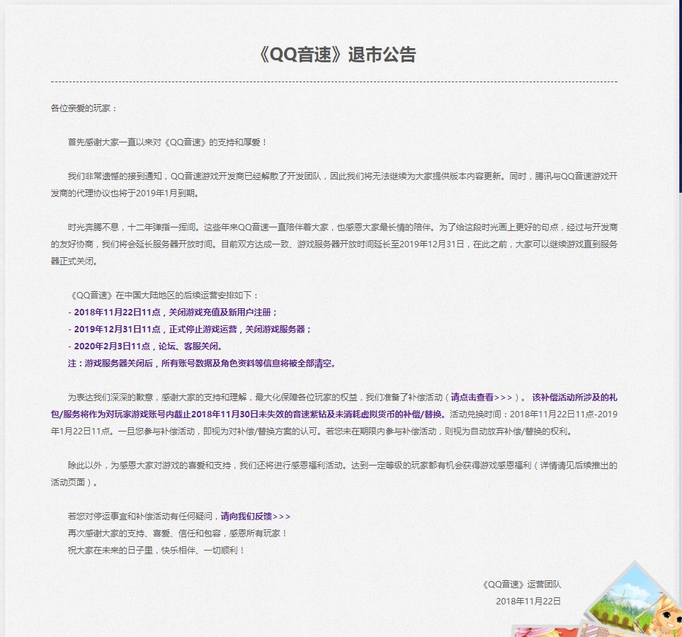 综合以上原因,《QQ音速》国服决定将于2018年11月22日,关闭游戏充值及新用户注册,2019年12月31日彻底停服。