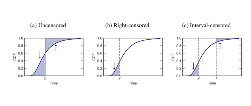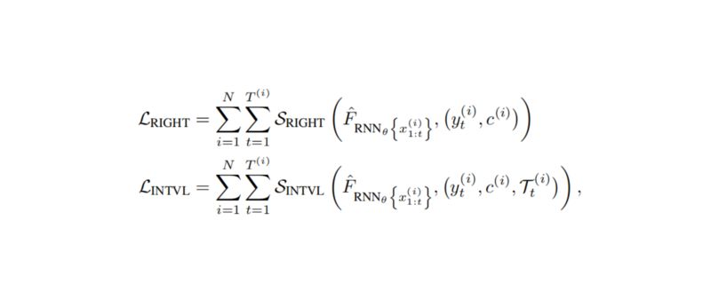 为了预测事件发生所需时间,我们提出了 Survival-CRPS,用于计算右删失或间隔删失数据的概率: