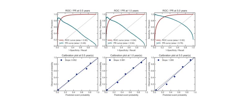 通过对死亡时间的整体预测,这个模型也可以应用于对不同时间点进行预测。当预测 6 个月、1 年和 5 年内的死亡概率时,我们的模型可以保持很好的校准度,以及极高的区分度。