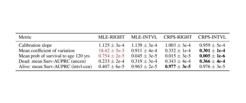我们在死亡预测任务上进行实验,评估四个不同的训练目标:最大似然 S-MLE-RIGHT 和 S-MLE-INTVL,以及基于我们提出的评分法则的损失函数:S-CRPS-RIGHT 和 S-CRPS-INTVL。