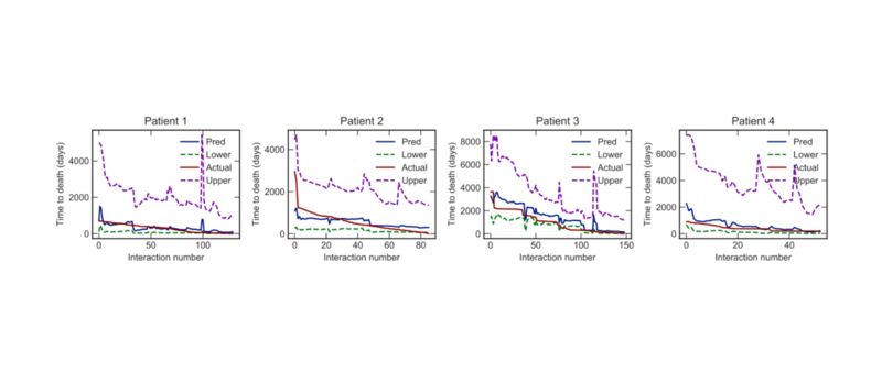 我们通过构建一个多层循环神经网络,将提出的方法应用在死亡预测任务中。网络输入为特征序列(EHR 中的病人信息),来预测概率分布函数 F 的参数。该网络只依赖目前和之前的时间点数据,不依赖未来的数据。每个时间点输出的概率分布构成整体损失: