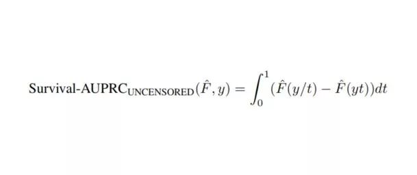 Survival-AUPRC 的最高分为 1,此时预测分布为一个狄拉克函数,在事件发生时间附近聚集。最低分数为 0,此时预测分布无穷大。所有样例的 Survival-AUPRC 分数的平均值为预测的质量提供了一个整体的评估。
