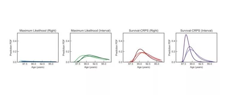 对比之下气象学预报通常是基于过去和目前的观测情况,对所有的天气情况作出全面的预测分布。预测结果由最大化预测分布的锐利程度来评价。一个预测分布的有用程度体现在它的锐利程度中,即数据的聚集程度。为了提高预测分布曲线的锐利程度,我们提出采用优于最大似然法的适当评分法则(Proper Scoring Rule)作为训练的目标函数。我们将 CRPS 扩展至生存问题中,定义为 Survival-CRPS,并且分别进行了数据右删失和间隔删失的延伸。