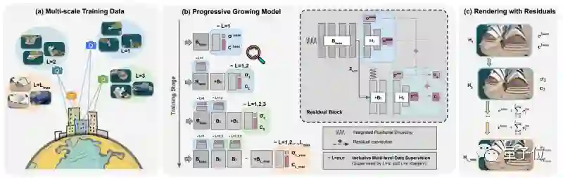 在每个训练阶段附加一个额外的块来扩展模型。每个块都有自己的输出head,用于预测连续阶段之间的颜色和密度残差,促使块在近距离观察中关注新兴细节;