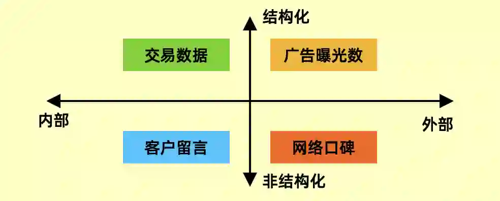 3)外部的结构化数据。这些数据同样具备用数值量化表现,差别是企业并不直接拥有这些数据。比如,在百度投放广告的曝光量、在知乎发布文章的阅读量等等。