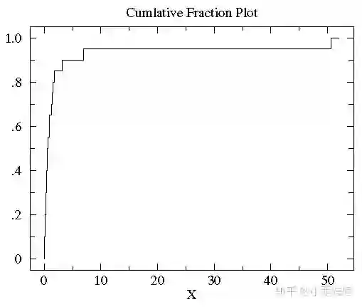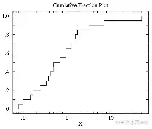 举个例子,对于数据集 {1.26, 0.34, 0.70, 1.75, 50.57, 1.55, 0.08, 0.42, 0.50, 3.20, 0.15, 0.49, 0.95, 0.24, 1.37, 0.17, 6.98, 0.10, 0.94, 0.38},先对其排序为 {0.08, 0.10, 0.15, 0.17, 0.24, 0.34, 0.38, 0.42, 0.49, 0.50, 0.70, 0.94, 0.95, 1.26, 1.37, 1.55, 1.75, 3.20, 6.98, 50.57}。其中比0.24小的一共有4个,占数据集的 1/5,所以0.24的累积分布值是0.2,依次类推我们可以画出累积分布图。
