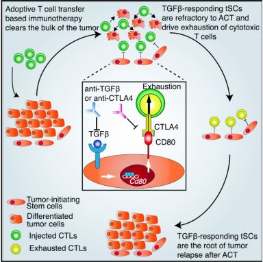 为了解决这个问题,来自Elaine Fuchs实验室的研究人员设计了一个鳞状细胞癌(SCC)模型。使用单细胞RNA测序(RNA-seq)和谱系追踪,他们发现转化生长因子β(TGF-β)在肿瘤复发中起到关键作用。随后他们发现这一分子通过促进CD80的表达进而使部分肿瘤细胞逃逸于机体的免疫查杀。同时,研究人员发现阻断TGFβ蛋白质或可有效防止肿瘤复发的情况出现。这一研究结果发表于《Cell》杂志。