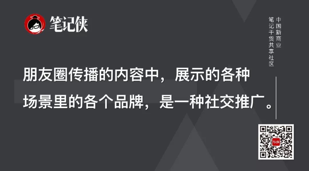 朋友圈传播的内容中,展示的各种场景里的各个品牌,就是一种社交推广。
