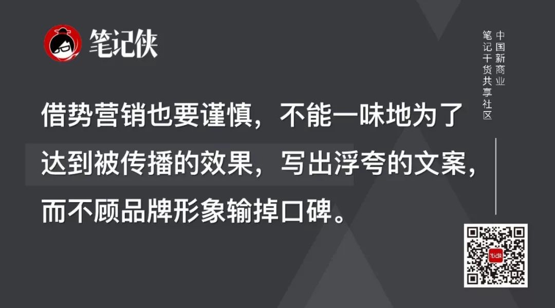 借势营销也要谨慎为之,不能一味地为了达到被传播的效果,写出浮夸的文案,而不顾品牌形象输掉口碑。