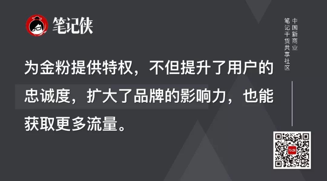 他们就像是企业和用户之间的强力胶,拥有他们,就等于拥有了更多的用户。为金粉提供特权,不但提升了用户的忠诚度,扩大了品牌的影响力,也能获取更多流量。