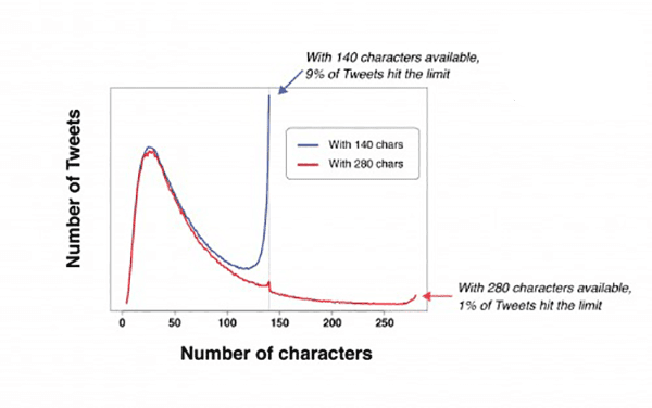 测试结果发现,如果将消息长度限定在 140 字符以内,用户发送英文消息会碰到许多障碍。此外,Twitter 还发现,随着字符数增多,用户用来编辑推文的时间也随之减少。与此同时,用户关注的人、使用 Twitter 的时间也变多了,与其他用户的互动也变多了。