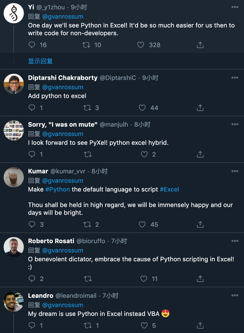 而在这条推文下,很多开发者已经开始畅想能在 Excel 中使用 Python 了。