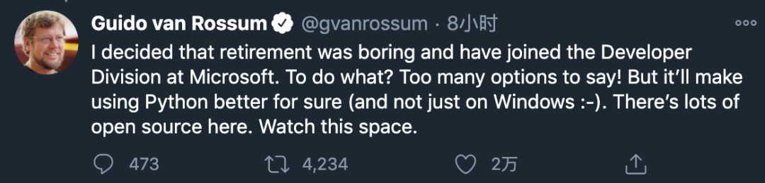 在从 Dropbox 退休一年后,64 岁的 Python 之父吉多 · 范罗苏姆(Guido van Rossum)宣布复出并加盟微软。