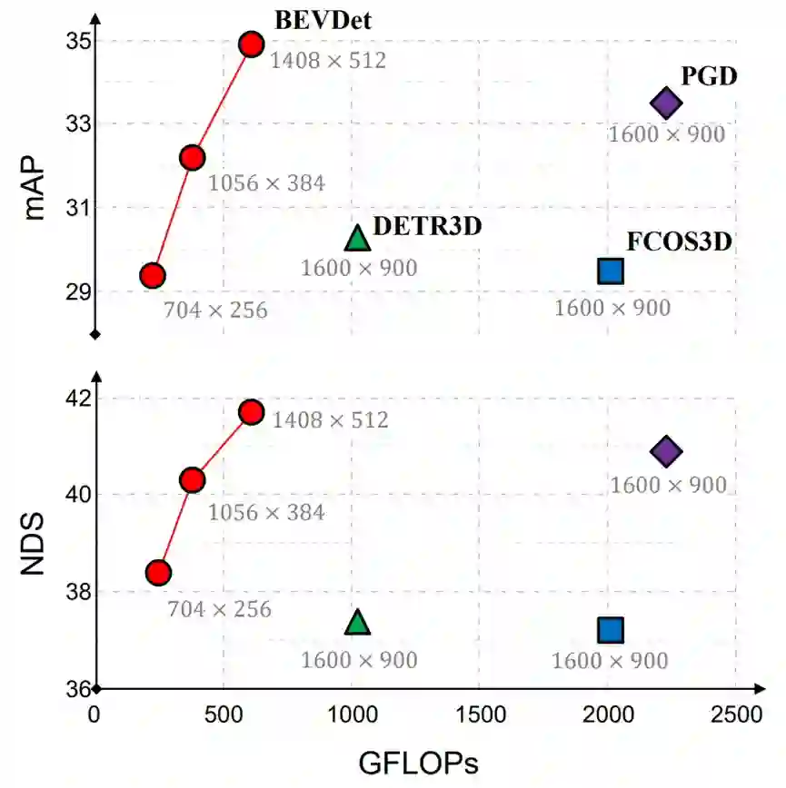BEVDet 在纯视觉 3D 目标检测公开测试集上同时具备高性能和低算力要求的特点