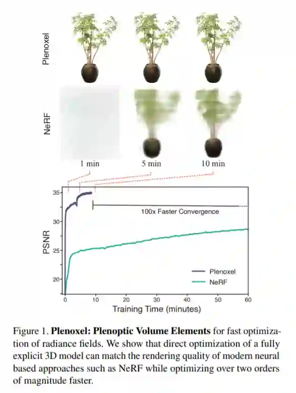 在本文中,来自加州大学伯克利分校的研究者瞄准了这一问题,提出了一种名为 Plenoxels 的新方法。这项新研究表明,即使没有神经网络,从头训练一个辐射场(radiance field)也能达到 NeRF 的生成质量,而且优化速度提升了两个数量级。