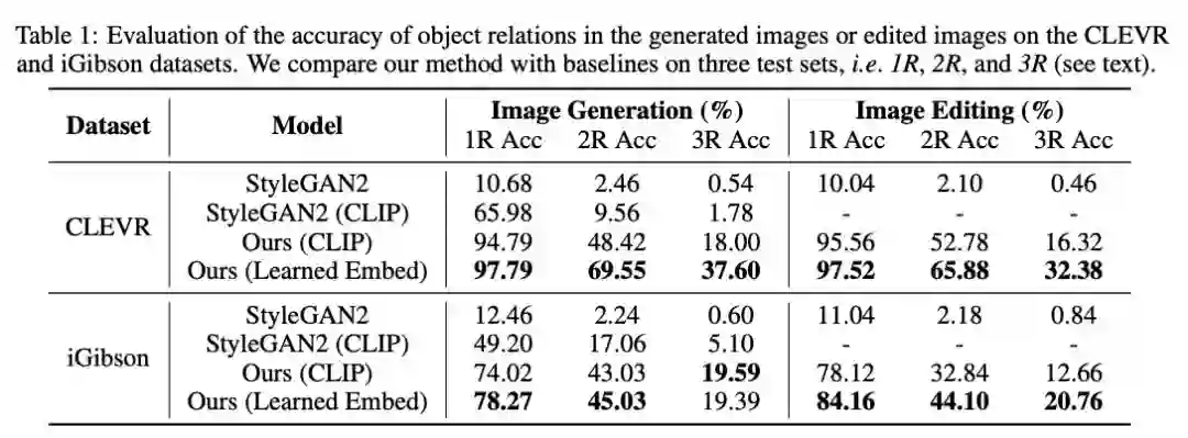 CLEVR 和 iGibson 数据集上生成图像或编辑图像中物体关系的准确率评估。
