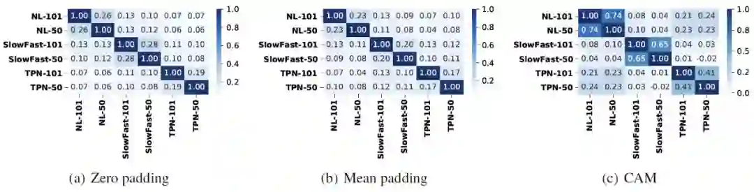 与图片数据相比,视频数据具有额外的时序信息,该类信息能够描述视频中的动态变化。目前已有多种不同的模型结构(例如:Non-local,SlowFast,TPN)被提出,以捕获丰富的时序信息。然而多样化的模型结构可能会导致不同模型对于同一视频输入的高响应区域不同,也会导致在攻击过程中所生成的对抗样本针对白盒模型产生过拟合而难以迁移攻击其他模型。为了进一步剖析上述观点,来自复旦大学姜育刚团队的研究人员首先针对多个常用视频识别模型(video recognition model)的时序判别模式间的相似性展开研究,发现不同结构的视频识别模型往往具有不同的时序判别模式。基于此,研究人员提出了基于时序平移的高迁移性视频对抗样本生成方法。