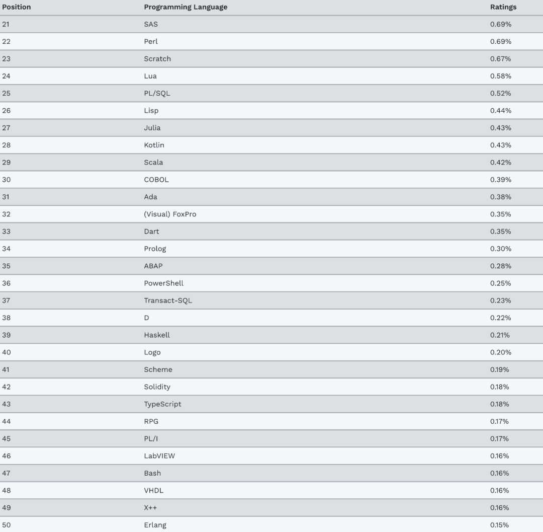ActionScript, Apex, Awk, B4X, bc, Bourne shell, C shell, cg, CLIPS, Clojure, Common Lisp, Crystal, Elixir, Emacs Lisp, F#, Forth, Groovy, Hack, Icon, Inform, Io, J#, Korn shell, Ladder Logic, ML, MQL5, NATURAL, NXT-G, OCaml, OpenCL, OpenEdge ABL, Pike, PILOT, PostScript, Q, Racket, Raku, REXX, Ring, Simulink, Small Basic, Smalltalk, Snap!, SPARK, Stata, Tcl, Vala/Genie, VBScript, Verilog, WebAssembly