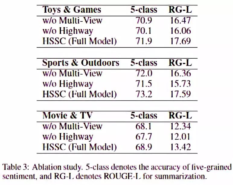 特征消融实验结果如图,其实比较奇怪的结果,highway重要性比attention的高,这证明了其实在encode阶段对sentiment classification的监督信号要更重要,因为文本摘要和情感分类的区别太大。当然在decode阶段的attention也是有效的。