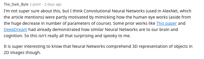 但有人却认为这没什么大惊小怪的:「我对此不太确定,但我认为卷积神经网络(AlexNet)在某种程度上是通过模仿人眼的工作方式来实现的(当然,除了参数数量的大量减少之外)。诸如本文和DeepDream之类的一些先前工作已经证明了神经网络与我们的大脑和认知有多么相似。因此,这对我来说并不是真的那么令人惊讶和恐怖。」