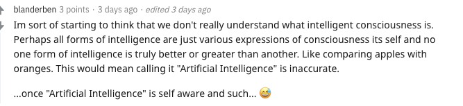 「我有点开始认为,我们并不真正理解智能意识是什么。也许所有形式的智能都只是自我意识的不同表达,没有一种智能真的比另一种更好或更强大。」