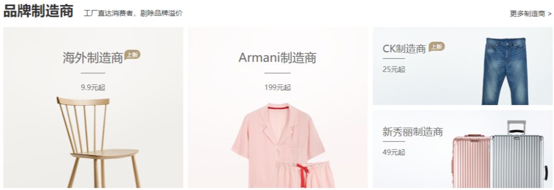 网易严选被称为“互联网时代的精品百元店”,商品价格都很有竞争力。严选的商业逻辑是:把溢价很高的大品牌原厂商品,附加上网易的品牌属性,以相对的平价出售。看看下图:CK 制造商做的牛仔裤 25 块起,新秀丽制造商做的箱子 49 块起,Armani 制造商出品的睡衣 199 元起。有了大品牌对比,这些商品简直自带“物美价廉”光环啊。