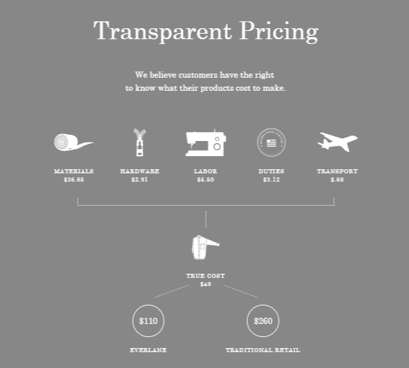再举个例子,加州有一家服装电商 Everlane,超快的发展速度曾吸引了全球媒体的报道,年轻人对它趋之若鹜。消费者喜欢它哪里呢?最重要的一点就是“透明定价”,就像下图这样,每件衣服都标清楚成本的组成因素和具体数字,让你对自己花的每分钱去向都一清二楚。