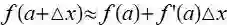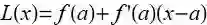 再次, 已知函数 f 和特殊值 a, 我们找出通过曲线 y = f(x) 上点(a, f(a)) 的切线. 这条切线的斜率为 f'(a), 其方程为 y-f(a)=f'(a)(x-a), 如果设切线为 y=*L*(x), 则