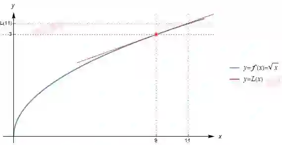 观察图形可以看到在 x=9 附近 L(x)非常接近于曲线 y=f(x) , 这意味着切线 L(11) 是对 f(11)=√11