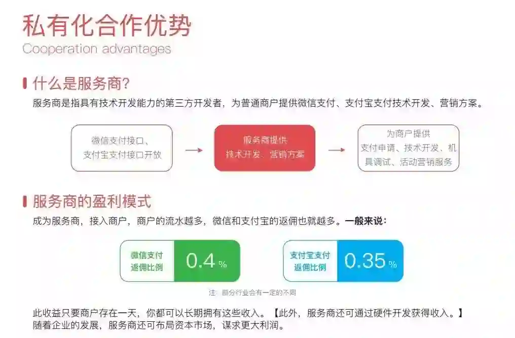 餐饮商家开通了点餐小程序,所有签约商户,微信支付官方给予服务商0.4%返佣;你只需要签约其中的100家商户,我们按平均每家餐厅每天的流水为1万元,那么你仅仅通过返佣的收入是:100家*10000(元)*0.4%(返佣)*365(天)=146万元/年