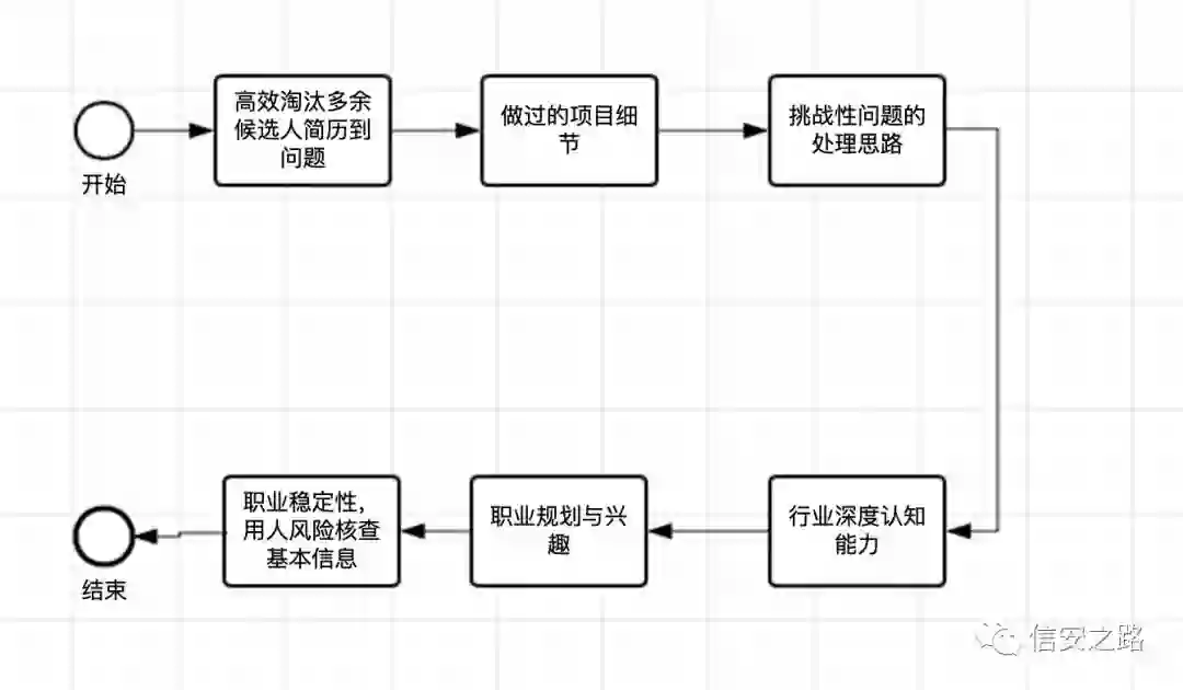 我们抛开一二三面等面试轮数不谈,我们只谈核心的问题,企业如何在众多的候选人中,筛选一个足够强大的安全技术人员,不过这些只是方法论,在你没有足够的基础前,还是会挂掉,但会给你提供非常高的努力方向。个人认为流程可以高度抽象为以下流程: