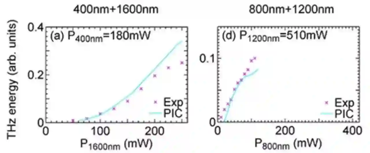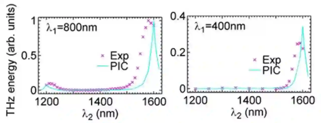 图1. 左图中第一束激光波长为800nm,第二束激光波长在1200nm到1600nm间变化,发现太赫兹波能量峰值出现在1200nm和1600nm附近(波长比为3:2和2:1);右图中第一束激光波长为400nm,当第二束激光波长为1600nm时,出现太赫兹波能量峰值,对应的波长比为4:1。在两幅图中“x”点为实验结果,实线为KLAPS粒子模拟(PIC)结果。
