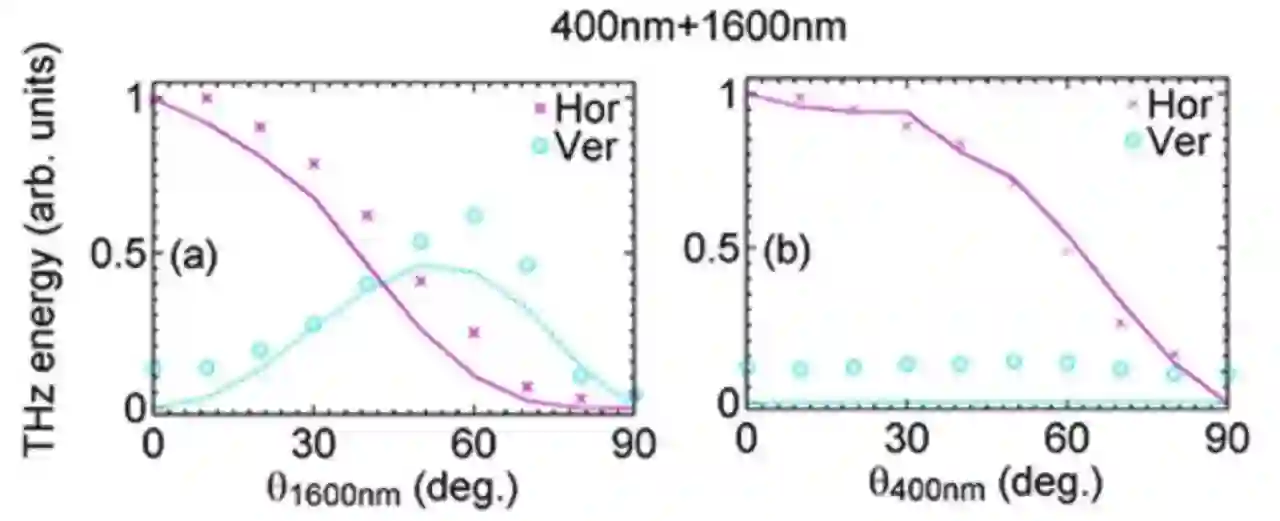 图2. 双色场方案中采用400nm和1600nm激光组合,两束激光初始偏振均在水平方向上,然后分别旋转1600nm激光的偏振(左图)和400nm激光的偏振(右图),让其具有竖直方向的分量。在左图中随着1600nm激光的旋转角从0增加到90度,太赫兹波水平分量逐渐减小,竖直分量先增加再较小;在右图中随着400nm激光的旋转角从0增加到90度,太赫兹波竖直分量始终处于很低的水平。此实验结果与我们的等离子体电流模型预测的太赫兹波椭圆偏振率正比于(λ长/λ短)4相符。在两幅图中“o”点为实验结果,实线为KLAPS粒子模拟(PIC)结果。