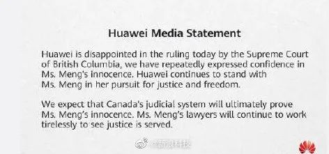 5月28日消息,加拿大不列颠哥伦比亚省高等法院温哥华当地时间27日上午(北京时间28日凌晨)公布了孟晚舟引渡案的第一个判决结果,认定华为公司副董事长、首席财务官孟晚舟符合“双重犯罪”标准,因此对她的引渡案将继续审理,孟晚舟女士将留在加拿大参加后期的相关听证,并等待新的审判结果。孟晚舟女士当天出庭并听取法庭所做的判决。对此,华为发表如下声明:我们对不列颠哥伦比亚省高等法院的判决表示失望。我们一直相信孟女士是清白的,我们也将继续支持孟女士寻求公正判决和自由。我们希望加拿大的司法体系最终能还孟女士清白。孟女士的律师团队将不懈努力,确保正义得到伸张。