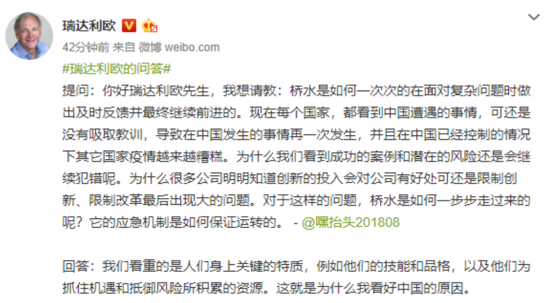 【桥水创始人达利欧:正是因为中国人具备的技能和品格看好中国】5月27日讯,在回答粉丝关于“桥水是如何针对复杂问题做出反馈”提问时,桥水创始人达利欧表示,他较为看重的是人们身上关键的特质,例如技能和品格,以及人们为抓住机遇和抵御风险所积累的资源。这就是为什么看好中国的原因。