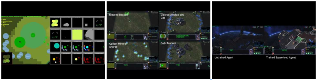 更困难环境有诸如 DeepMind 与暴雪合作的 PySC2,需要智能体学会复杂的协同、对抗策略。虽然 AlphaStar 在这一环境中取得了令人瞩目的成果,但仍存在很多亟待解决的问题。以下为 PySC2 环境示意图。