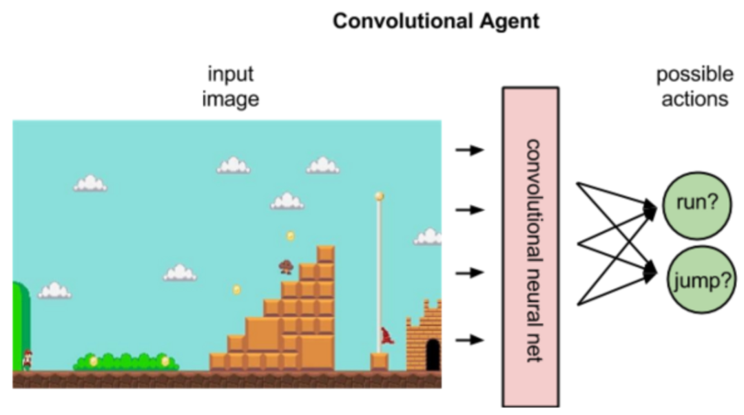 下图展示了 RL 智能体是如何仅以游戏图像作为输入,来学习马里奥控制策略的。
