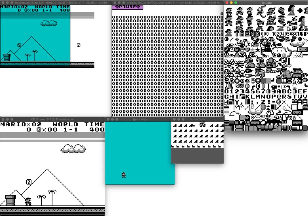 如果你在加载了 Super Mario Land ROM 的情况下运行上述代码,则将在下面得到图片和终端输出。值得注意的是,Mario 的形态显示为索引 0,1,16,17。
