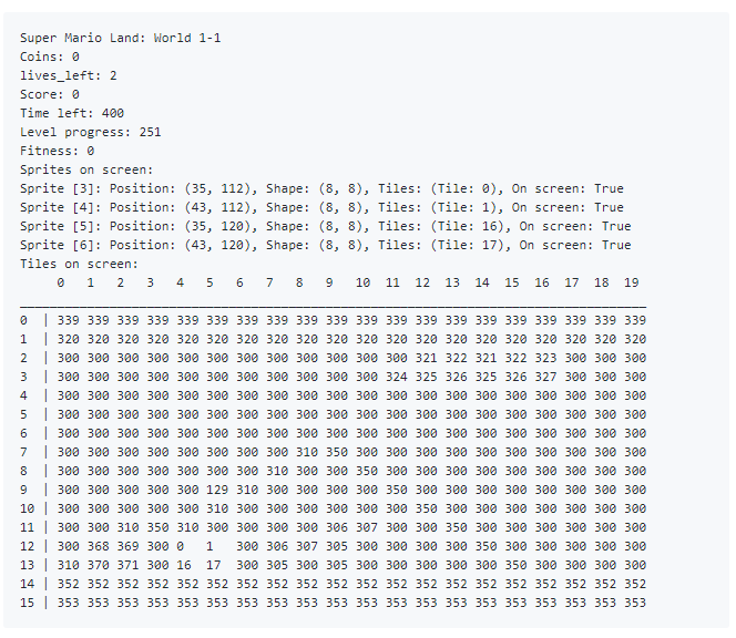 mario = pyboy.game_wrapper()mario.start_game()assert mario.score == 0assert mario.lives_left == 2assert mario.time_left == 400assert mario.world == (1, 1)assert mario.fitness == 0 last_fitness = 0print(mario)