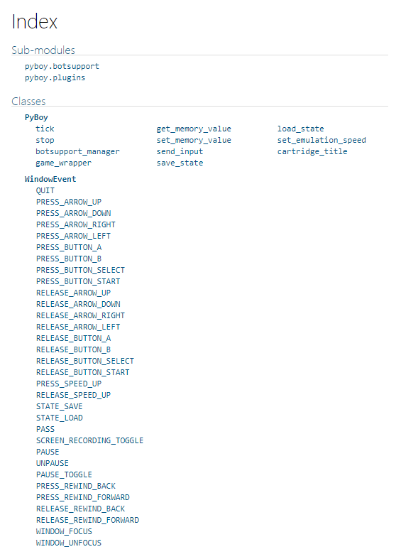 如果用户需要创建一个自己的机器人或者是 AI,可以在 PyBoy Documentation (https://baekalfen.github.io/PyBoy/index.html) 找到所有用以支持的外部组件,其中各种类及其用法都非常详细,这里不再一一赘述。(如下图结构索引)
