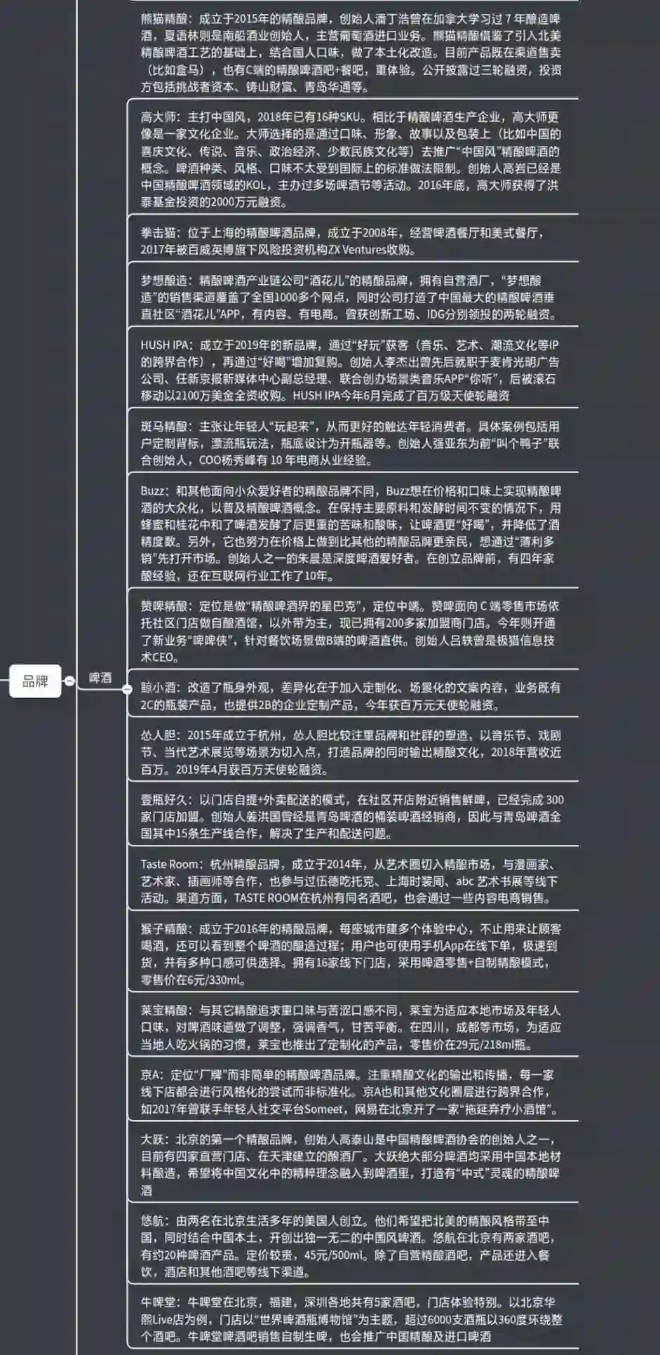 熊猫精酿公开披露过三轮融资,投资方包括挑战者资本、铸山财富、青岛华通等;高大师在2016年底获得了洪泰基金投资的2000万元融资;拳击猫于2017年被百威英博旗下风险投资机构ZX Ventures收购;梦想酿造(酒花儿)曾获创新工场、IDG分别领投的两轮融资;精酿品牌 HUSH IPA、鲸小酒和怂人胆今年分别获百万元天使轮融资。