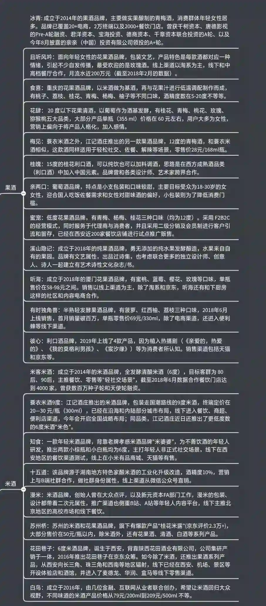果酒冰青曾获千树资本、唐德影视的Pre-A轮融资、君洋资本、宝海投资、德商资本、千章资本联合投资的A轮、以及今年8月披露的亲亲(中国)投资有限公司领投的A+轮;米客米酒曾获数百万种子轮和天使轮融资;